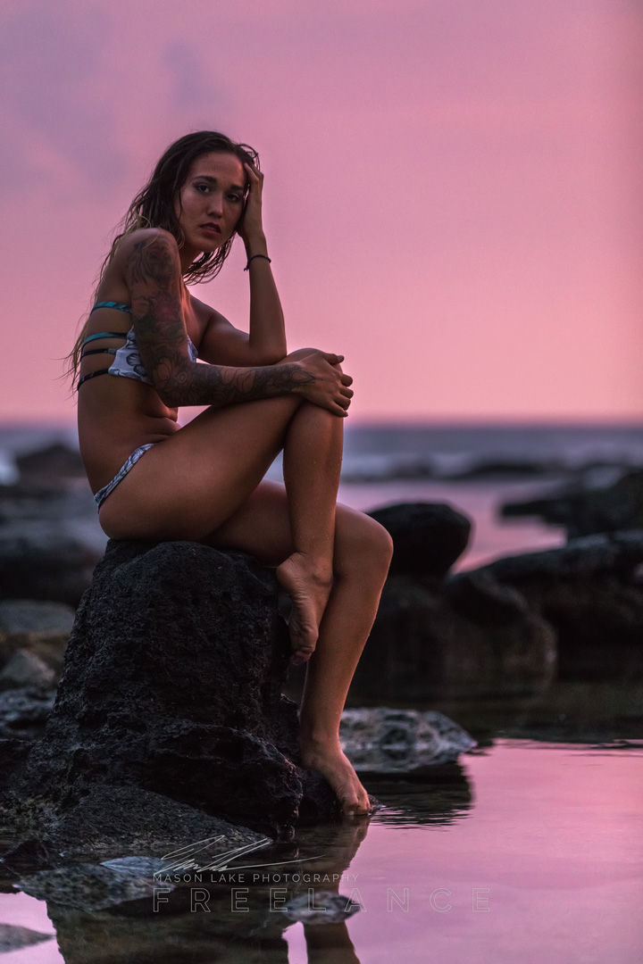 Especially on the ocean the sunset after glow is very dramatic, the reflection of the water with the clouds covering the sunlight but allowing the color to reflect into the sky is amazing to see. I had ended the shoot cause it got dark but then boom! The color came back in full force so I had Wanalee quickly go back in the tide pool. The sky was super magenta at one point just like the 3rd pic shows, I did no color tweaks to that pic, the others I did a bit but not much.
